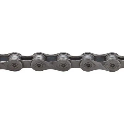 Solid pins, inner and outer plates make for an economical chain choice with all the performance of higher level X-Series chains. Includes KMC Missing Link 9. Eco ProTeQ treatment doubles the rust resistance compared to KMC’s RustBuster treatment.. Double X bridge shape with inner and outer plate chamfering for smooth and fast shifting. Mushroom riveted pins for the highest pin power and allows shifting under heavy loads. Stretch Proof heat treatment so the chain last longer and goes farther. Item Specifications: , Links (links)116, ColorGray, Width6.6 mm, Drivetrain Speeds9, Chain Connection TypeReusable Master Link, Half Link ChainNo, Weight325 g,