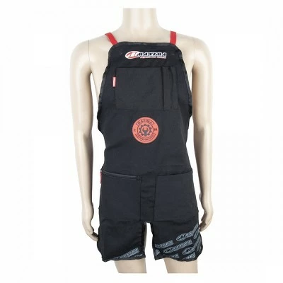 CLOTHING APRON MAXIMA BK/RD High quality apron features a side squeeze buckled waistband and separate should straps for comfort and improved fit. Features a large mid-chest pocket with pen holders, one large zippered waist pocket, and one large open top waist pocket. Split lower design provides coverage but improves mobility and flexibility while working. Stylish black and red design with Maxima logo on the chest, Maxima Certified patch in center and repeating Maxima print on the lower portion.