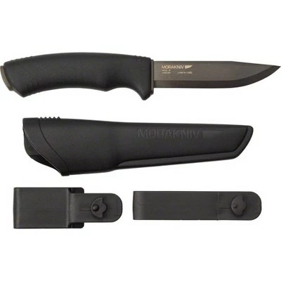 A very sturdy knife with a black coating on the carbon steel blade to protect against corrosion.