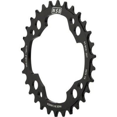 The NSB Variable Tooth Chainrings uses a ‘Thin-Thick’ variable tooth thickness mated with a standard chainring tooth profile to help retain the chain on the front ring during all types of riding. By increasing the tooth thickness on half of the ring’s teeth, the chain is given less room to move and virtually eliminates chain drop when running a single front chainring. Variable tooth profiling ensures ultimate chain retention. Machined from solid 7075 T6 Aluminum . Anodized black with laser etched graphics. Item Specifications: , Tooth Count32, Ring Position/TypeChain Retaining Single Ring, Drivetrain Speeds10, Drivetrain Speeds11, Chainring BCD94, ColorBlack, MaterialAluminum,