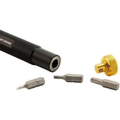 Designed for speed, precision, control, and versatility the Pro Bit Driver is ideally suited to assembly and tuning, and easily adapts to different tasks. Features precision S2 tool steel bits, machined aluminum body, ยผโ magnetic hex bit drive, and bearing-mounted rotating end cap. Add the compatible Multi-Torque Bit Set to store eight additional bits on board. Includes: 2mm, 2.5mm Hex, and T25 Torx. Ergonomic machined aluminum body with bearing-mounted rotating cap for precision and control. Magnetic bit drive accepts any standard ยผโ hex bit. Internal storage for two bits. Also compatible with Multi-Torque Bit Set.