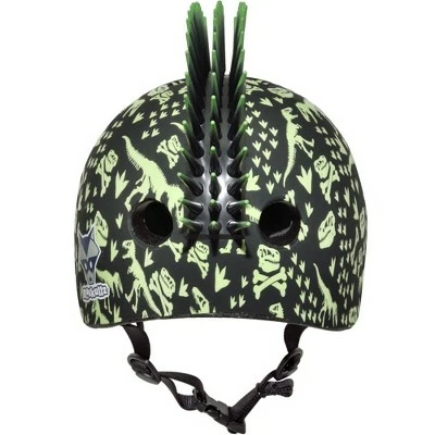 Make a ferocious statement with the Raskullz T-Rex Bonez Mohawk toddler bike helmet. This dinosaur-inspired bike helmet has bright green dinosaur skeleton images printed over the entire helmet and features an eye-catching 2โ tall bendable black 3D mohawk with bright green tips. Perfect for tearing it up like a dinosaur on a bike, scooter or skateboard. Recommended for ages 3โ5 years old, but will fit most heads measuring 48โ52 cm/18.9โ20.47 in. Always take a head measurement. Head sizes and shapes can vary, even within an age range. Complies with the U.S. CPSC Safety Standard for Bicycle Helmets for Persons Age 1 and Older (Extended Head Coverage).