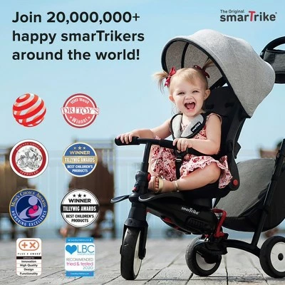 Children love exploring and smarTrike is here to make sure they do it in the safest, easiest way possible with the Black and White Vanilla Plus 4-in-1 Toddler Tricycle Push Bike.When they are babies, children start with a small wagon or push-car, then grow quickly through tricycle and scooters. The effortless touch steering technology allows you to take control of the trike with just 1 hand when they can’t. Keep your little ones cool with the sun canopy and ensure their protection with the 3-point harness and safety bar. A large storage bag on the back of the stroller allows you to pack everything you and your toddler need while strolling. Say goodbye to those training wheels, and let your little ones explore independently with this unique 4-in-1 design that adapts to your boy or girl as they grow older! SmarTrike features a line of safe, secure, and reliable riding tricycles for kids that are 1 year old, 2 years old, and 3 years old.