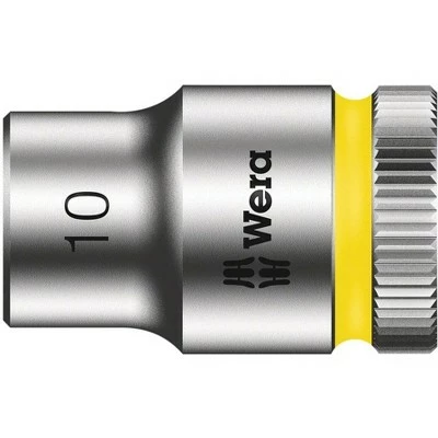 Manual and power tool socket insert (ISO 2725-Part 3) by Wera allows applications both in manual as well as power tools. “Take it easy” Tool Finder with color coding according to size – for simple and rapid accessing of the required tool. Featuring a good grip to allow easy pick-up even with oily hands. Ball stop groove, for hex head bolts and nuts; chrome vanadium steel, matt chrome-plated. 3/8 inch Zyklop socket. For manual and power tool operations (non-impact) . Knurling at lower end to enable easy gripping when used in manual applications. Equipped with ball stop groove. With Take it easy tool finder: color coding by size.