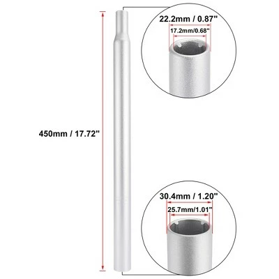 Easy to install. Made of aluminum alloy, Durable materials for long time service.Suitable for most of mountain bikes, road bike, MTB etc.There is a safe line mark on the seat post. Please insert at least above the minimum safety line.Specification:Material: Aluminum Alloy.Color: Silver Tone.Thickness: 2.5mm / 0.1″.Dimension: 450×30.4mm / 17.72″x1.20″(L*D).Hole 1 Size: 30.4×25.7mm / 1.20″x1.01″(OD*ID).Hole 2 Size: 22.2×17.2mm / 0.87″x0.68″(OD*ID).Note: The size measured by hand, so it may have a little 1-2 mm difference. Note: Please do measure the original outer diameter then choose the actual required diameter or measure the inner diameter of the frame tube before purchasing.Package Included:1 x Bicycle Seat Post.
